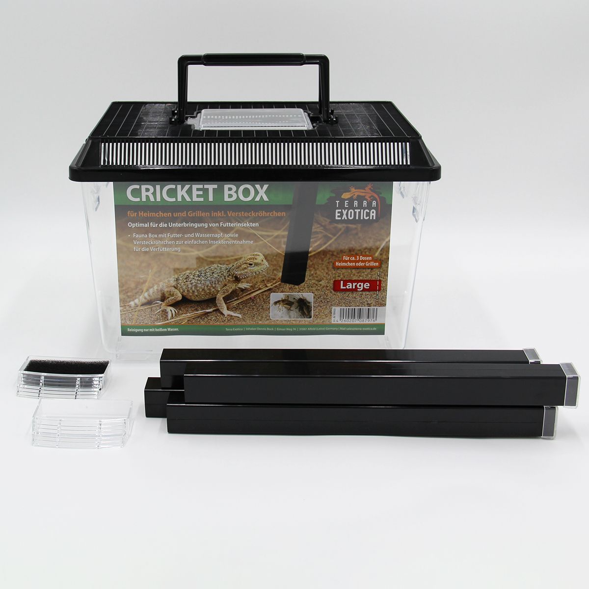 Die Cricket Box Large (30 × 19,5 × 20,5 cm) ist die ideale Lösung für die Hälterung von Futterinsekten wie Heimchen und Grillen. Sie bietet eine sichere, saubere und praktische Möglichkeit, Futtertiere bis zur Verfütterung zu halten und einfach zu entnehmen – perfekt für Reptilien- und Amphibienhalter.