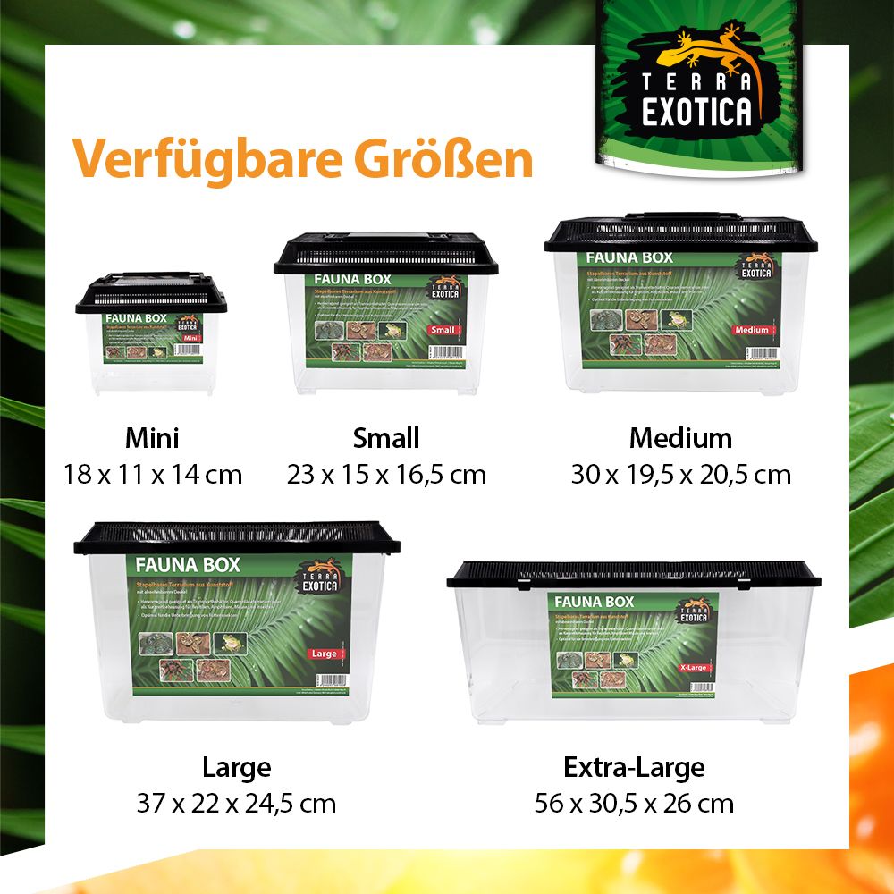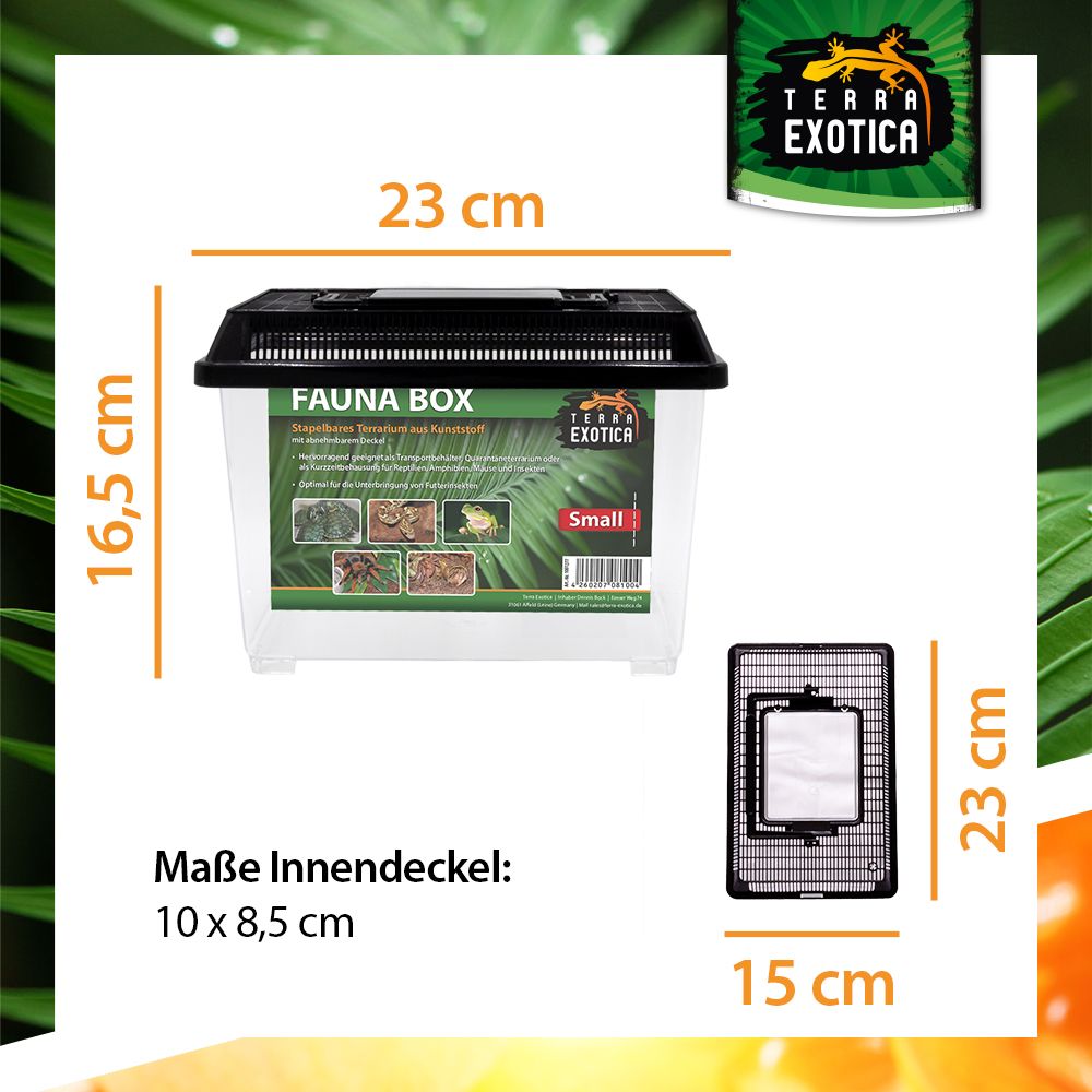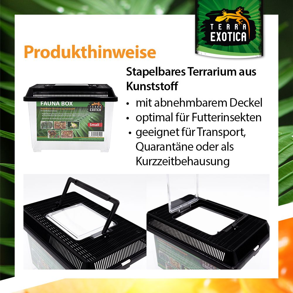 Die Fauna Box Small (23 × 15 × 16,5 cm) ist ein vielseitiges, stapelbares Kunststoff-Terrarium, das optimale Bedingungen für die Haltung, Zucht und den Transport verschiedenster Tierarten bietet. Sie überzeugt durch Stabilität, Funktionalität und einfache Handhabung – ideal für den privaten und professionellen Einsatz in der Terraristik.