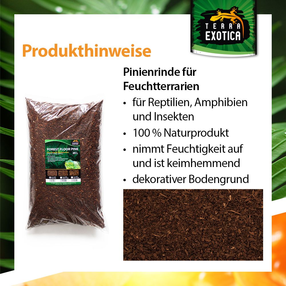 Die enthaltenen ätherischen Öle wirken keimhemmend, während die hohe Feuchtigkeitsaufnahme ein stabil feuchtes Terrarienklima sicherstellt. Forest Floor Pine ist biologisch abbaubar, dekorativ und langlebig – perfekt für eine naturnahe Gestaltung.