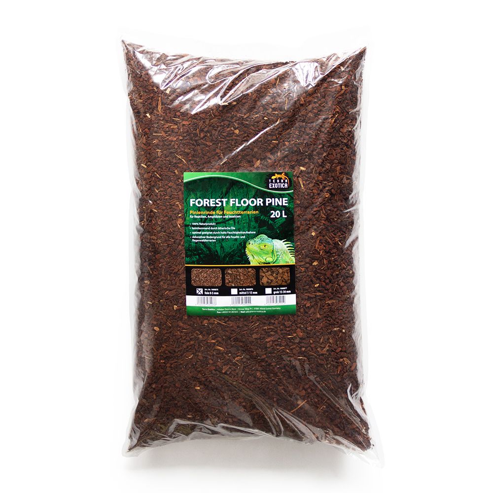 Terra Exotica Forest Floor Pine – Fein ist ein 100 % natürliches Substrat aus fein gesiebter französischer Pinienrinde (0–8 mm Körnung), ideal als Bodengrund für Feucht- und Regenwaldbewohner. Es unterstützt ein gesundes, humides Klima im Terrarium und trägt zur natürlichen Luftfeuchtigkeit bei.