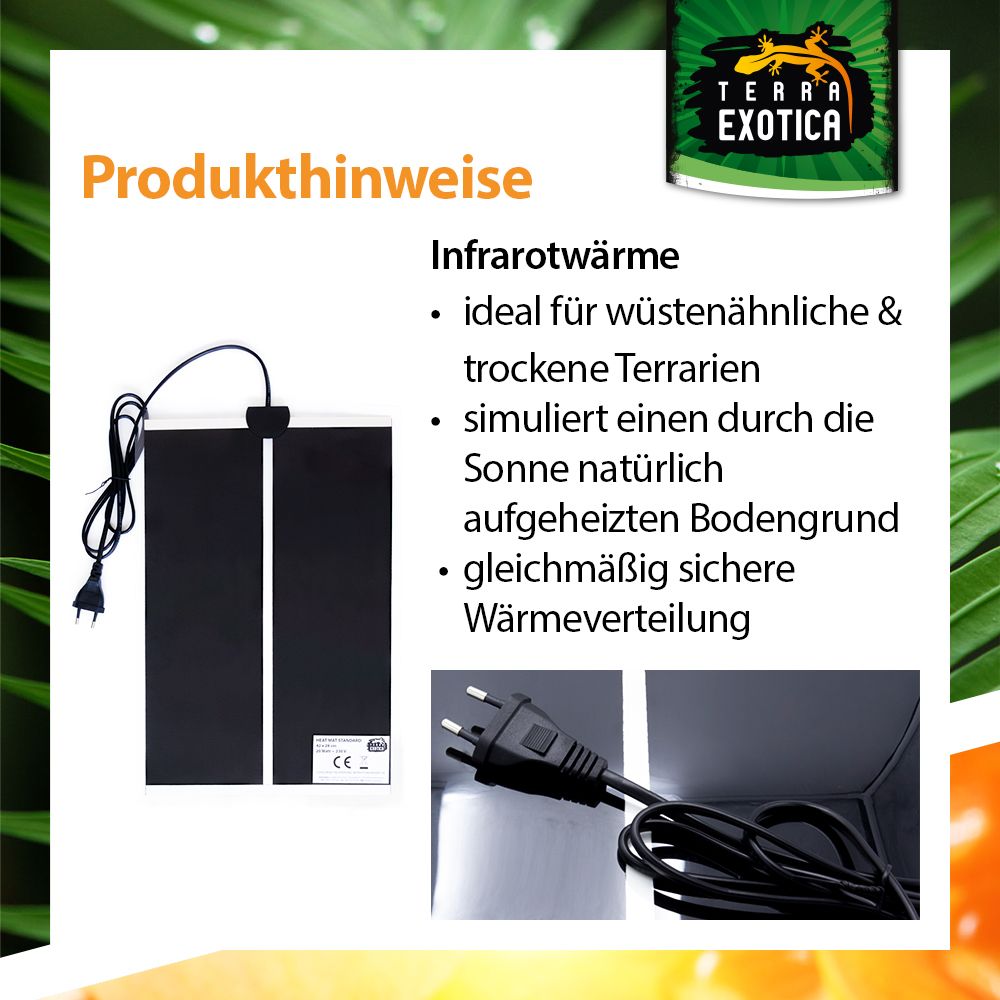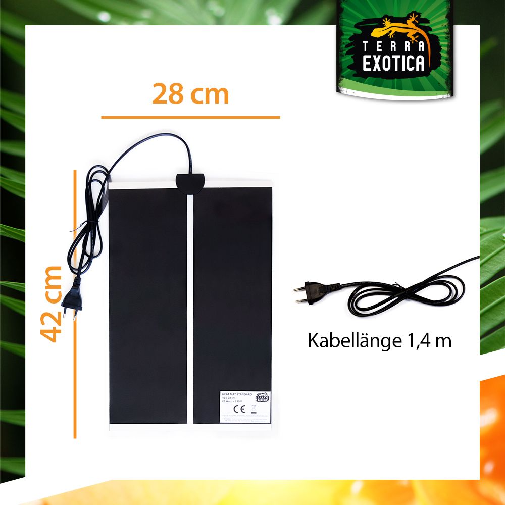Die Standard Heizmatte bietet eine zuverlässige und konstante Grundheizung für Terrarien. Sie simuliert den durch die Sonne erwärmten Bodengrund und sorgt für eine angenehme, gleichmäßige Wärme – ideal für Reptilien, Amphibien und andere Terrarientiere. Durch ihre trockene Oberfläche erhöht sie die Luftfeuchtigkeit nicht und ist somit besonders für trockene Lebensräume geeignet.