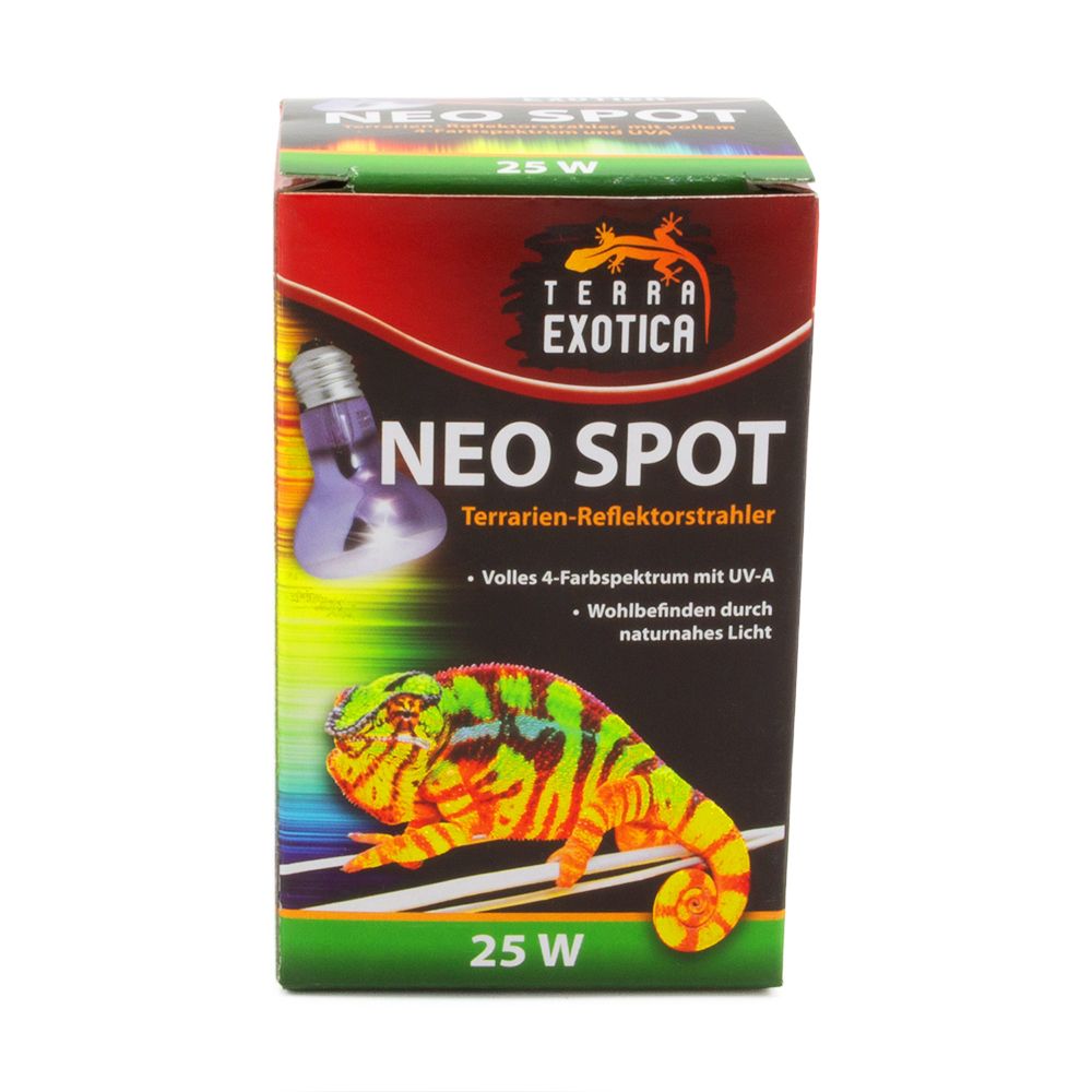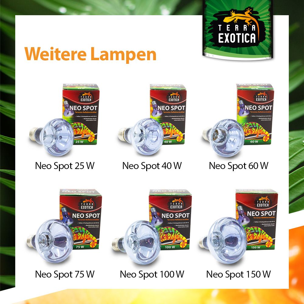 Der Neo Spot ist eine hochwertige Licht- und Wärmelampe mit vollem 4-Farbspektrum inklusive UV-Strahlung, die das natürliche Sonnenlicht imitiert. Sie fördert Vitalität, Farbenpracht und das Wohlbefinden der Terrarienbewohner und eignet sich hervorragend als permanente Licht- und Wärmequelle für alle Reptilien und Terrarientiere.