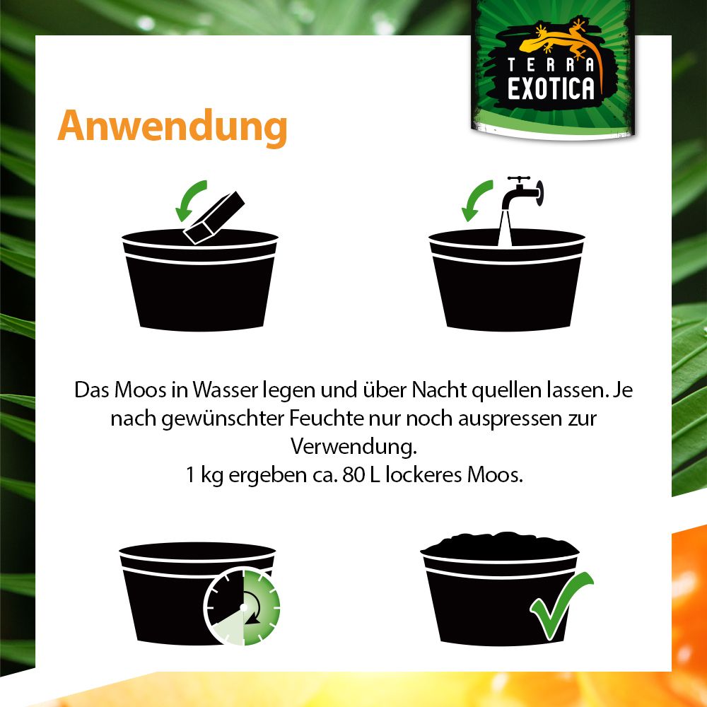 Das Moos erhöht die Luftfeuchtigkeit im Terrarium, dient als Feuchtigkeitsspender für Pflanzenwurzeln (z. B. Orchideen) und verlängert die Blütezeit. Dank seiner antibakteriellen und antibiotischen Eigenschaften ist es hygienisch, frei von Düngemitteln und Pestiziden, und eignet sich zudem als Eiablagesubstrat für Reptilien oder zur Überwinterung von Terrarientieren.
