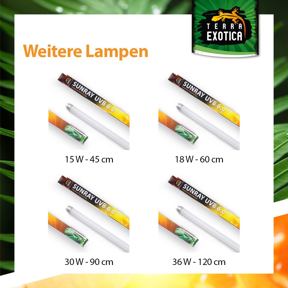 Die Terra Exotica Sunray UVB 6.0 ist eine Vollspektrum-Terrarien-Leuchtstoffröhre mit erhöhter UV-B-Abstrahlung, die speziell für Schildkröten, Leguane, Agamen und Chamäleons entwickelt wurde. Sie unterstützt die Vitamin-D₃-Synthese, welche für den Calciumstoffwechsel und damit für einen gesunden Knochen- und Panzeraufbau entscheidend ist. So wird effektiv Rachitis und anderen stoffwechselbedingten Knochenerkrankungen vorgebeugt.